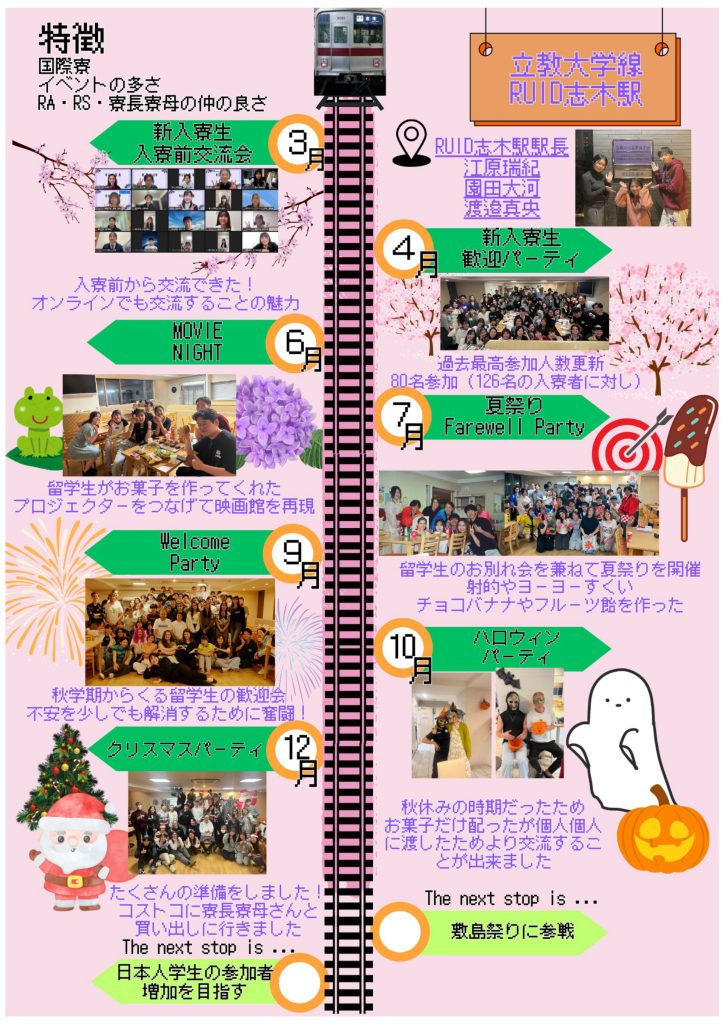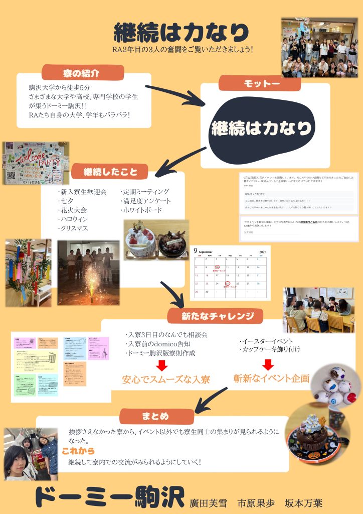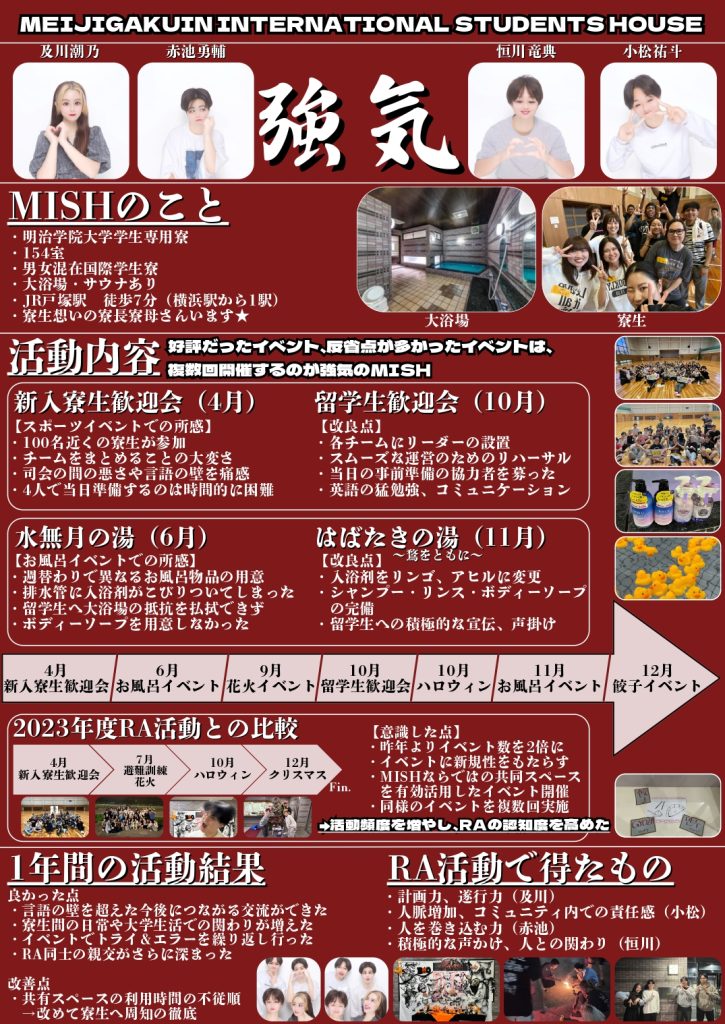 共立メンテナンスのレジデント・アシスタント(RA)プログラムは、学生寮を「生活の場」から「多様な経験ができる場所」へと進化させる取り組みとして、2015年にスタート。現在では、2024年12月時点で全国62棟の寮に導入され、現在200名を超えるRAが活動しております。RAは、寮生の学生生活をより楽しく、充実したものにするために、日々の生活をサポートし、寮生同士の交流を促進する「寮生にとっての心強い存在であり、寮生活を支援するリーダー」です。RAプログラムを通じて、参加する学生一人ひとりが人間的に成長し、それが寮全体や個々の寮生の成長にも繋がっています。