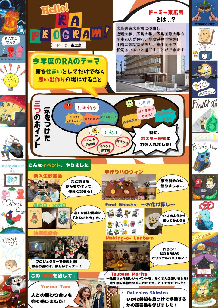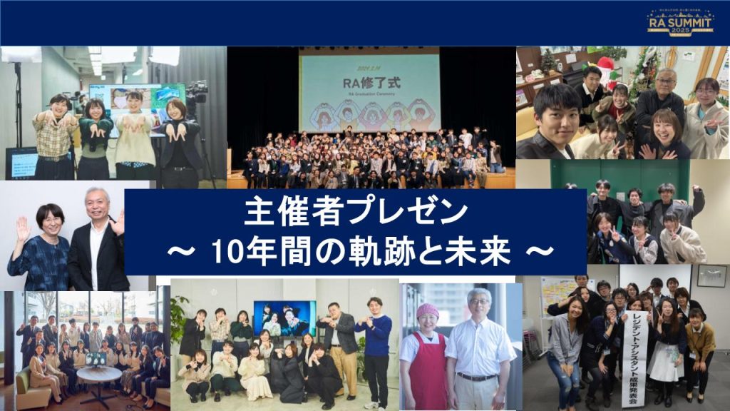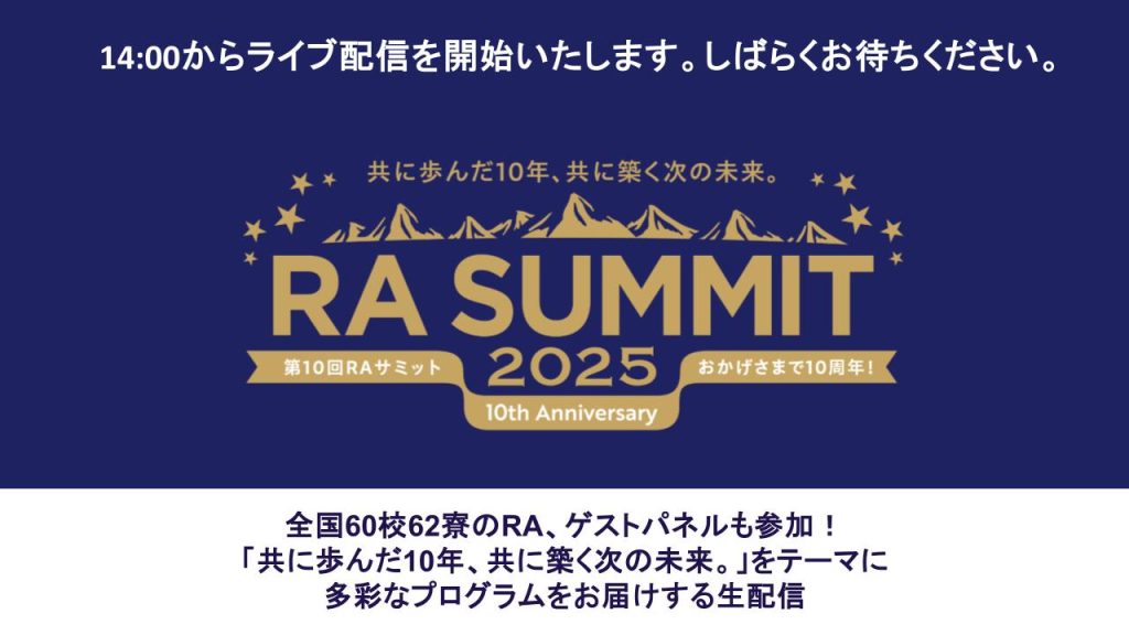2015年に15寮・37名からスタートしたRAプログラムは、現在では62寮にまで規模が拡大し、RA経験者の延べ人数は1,000名を超えました。 記念すべき10回目となる今年のRAサミットでは、第1部で会場での直接対話と交流を行い、第2部ではライブ配信を加えたハイブリッド型で全国に活動を発信します。10周年にふさわしい多彩なプログラムを通じて、未来への新たな一歩を共に踏み出します。